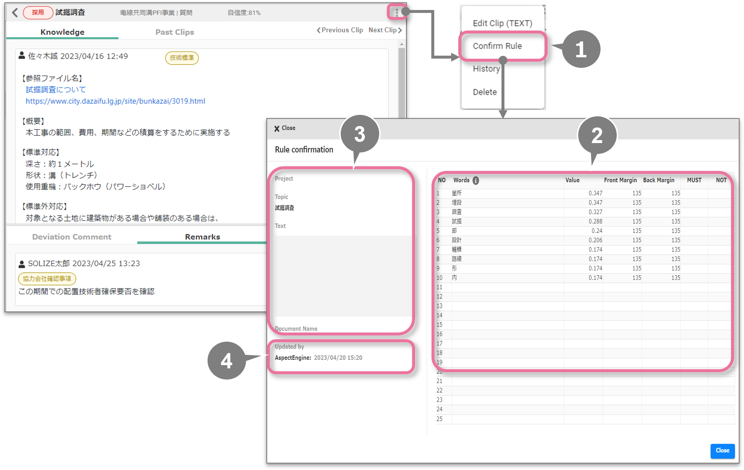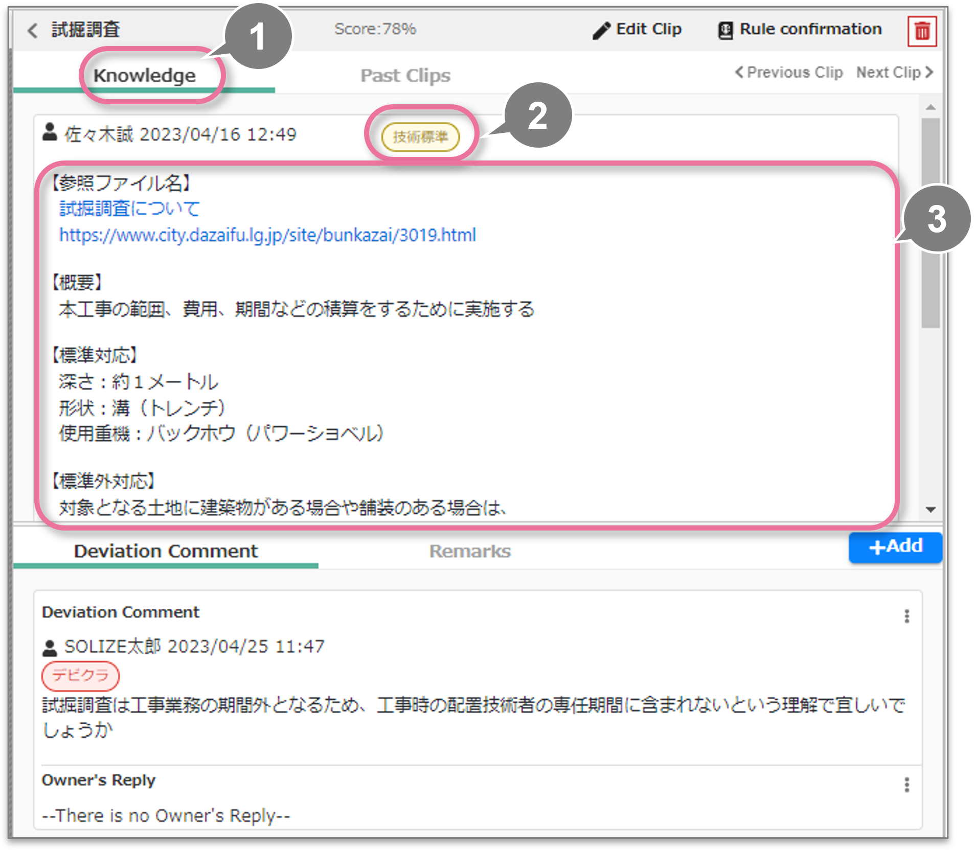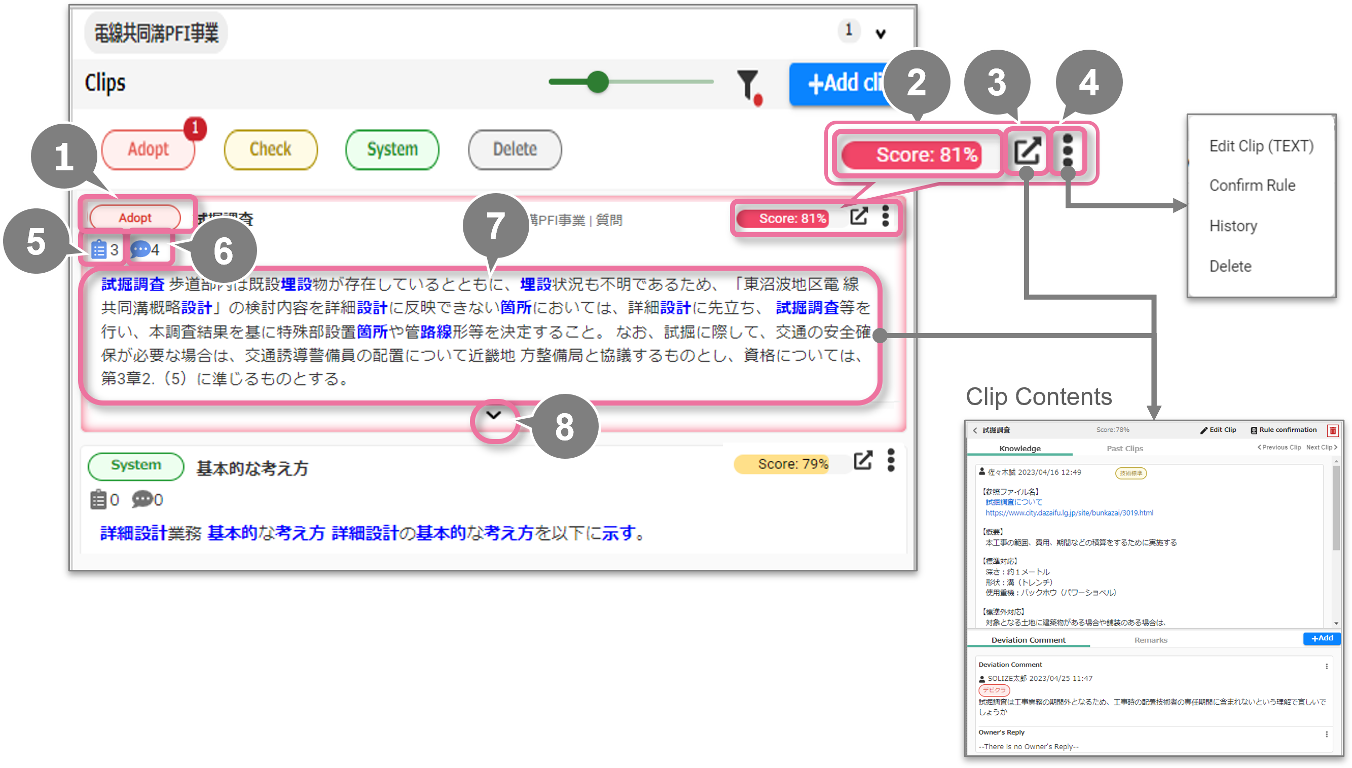 ナレッジ、過去クリップ、メモを参照することができます。AIが検出したクリップについては、検出に使われたルールを確認することもできます。