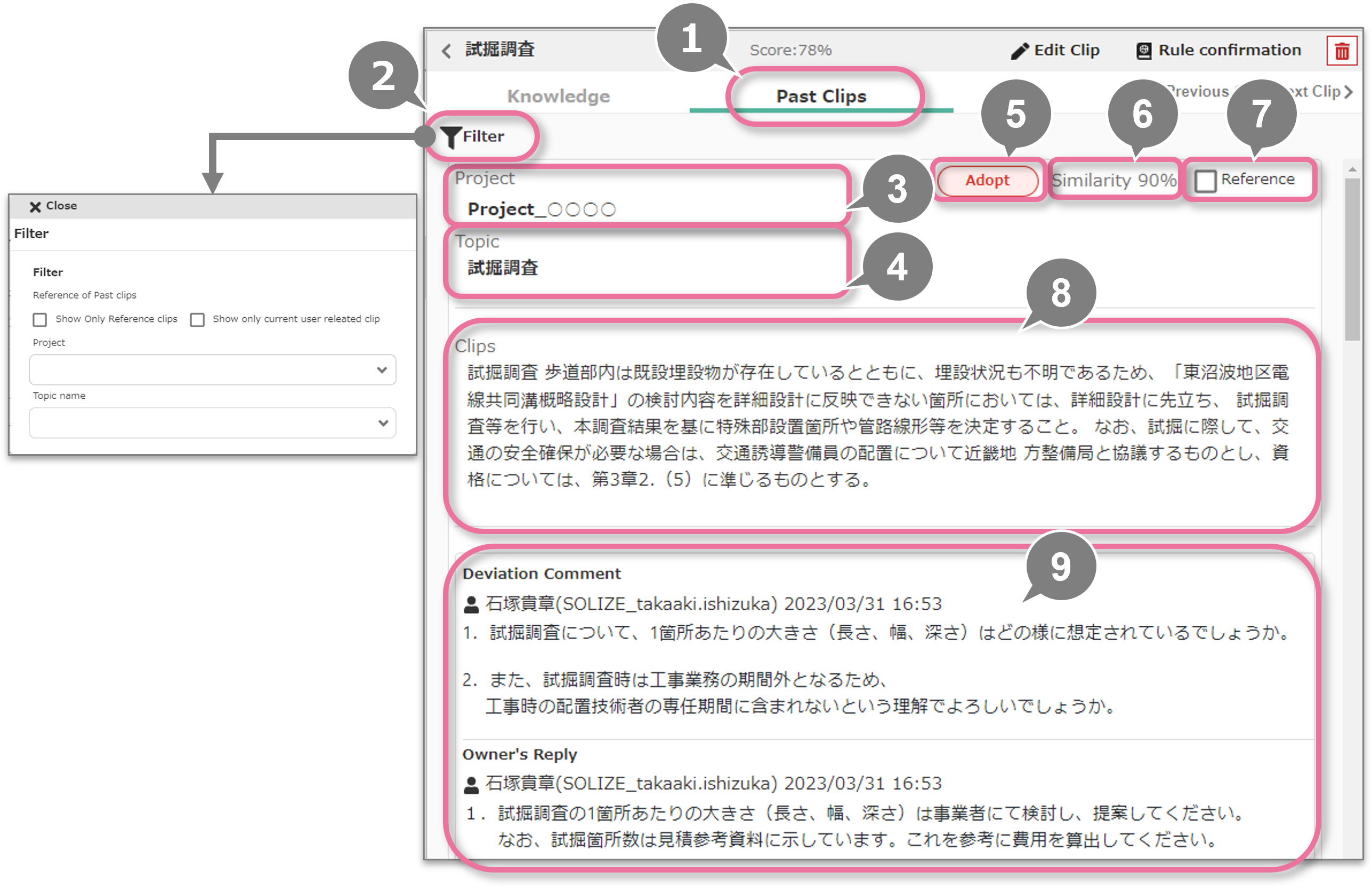 「参照クリップのみ表示」「担当クリップのみ表示」「プロジェクト」「トピック名」で過去クリップを絞り込みます