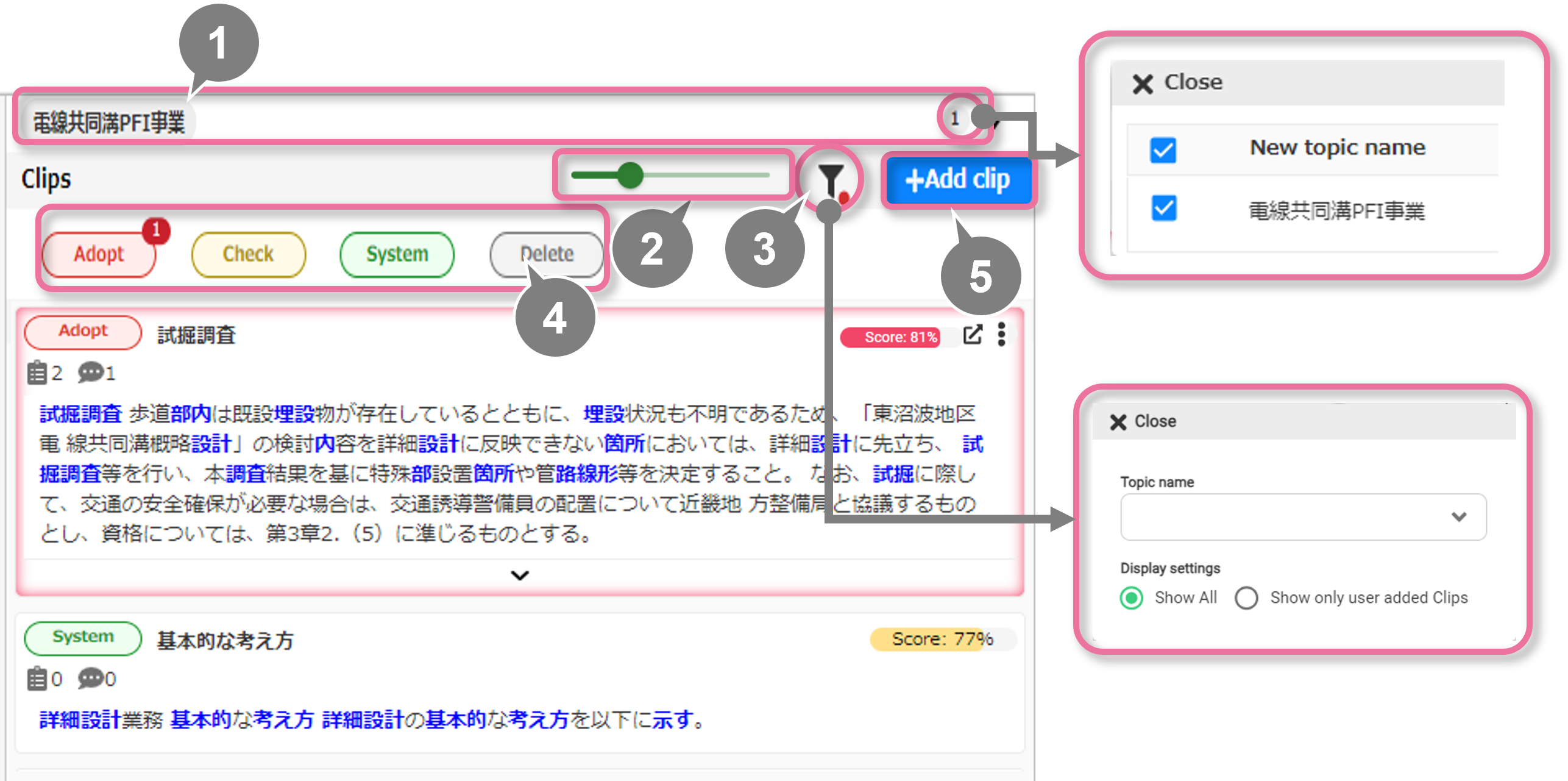 トピック名、ユーザーが作成したクリップのみか、AI検出も含めた全てのクリップを表示するか選択することができます。